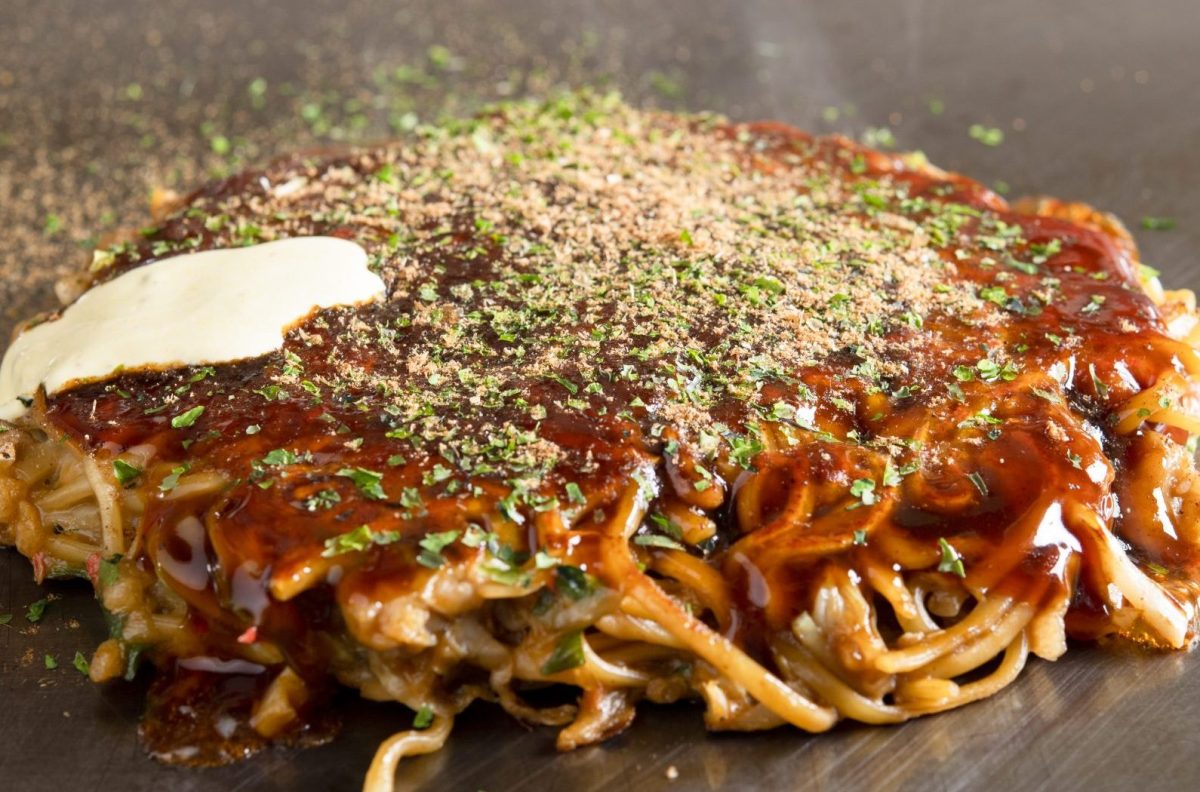 中に焼きそばが入っていてボリューム満点!お好み焼きのふっくら生地ともちもちの麺。両方楽しめます♪
